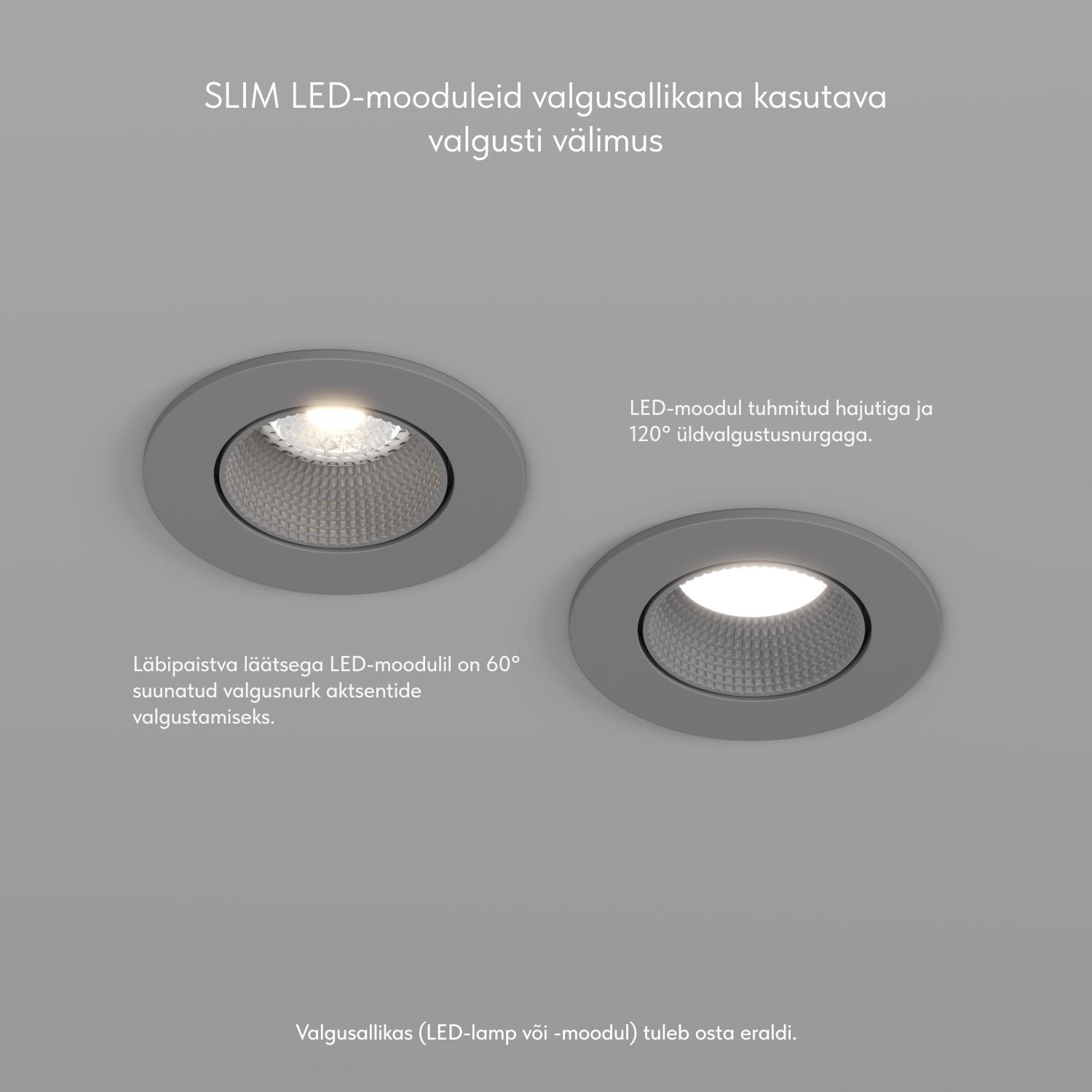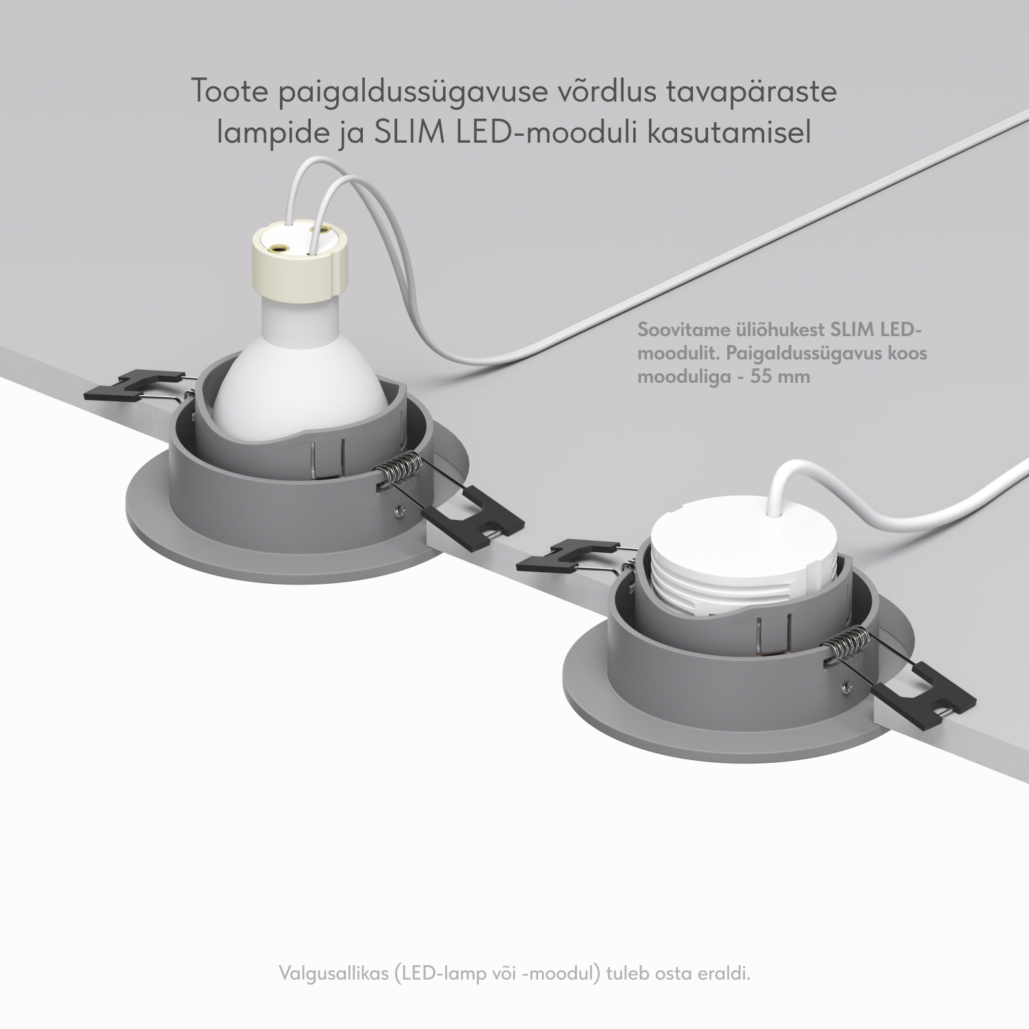 Sisseehitatud osa sügavus GU10 lambiga (kaasas hoidik): 88 mm. Sellest tavalise MR16 lambi kõrgus: 54 mm. Sisseehitatud osa sügavus DK/EU-4000-7W või DK/EU-3000-7W mooduliga on vaid 55 mm. Valgusti on mõeldud kasutamiseks koos LED-lambiga. Muud tüüpi lampide paigaldamine ei ole lubatud.