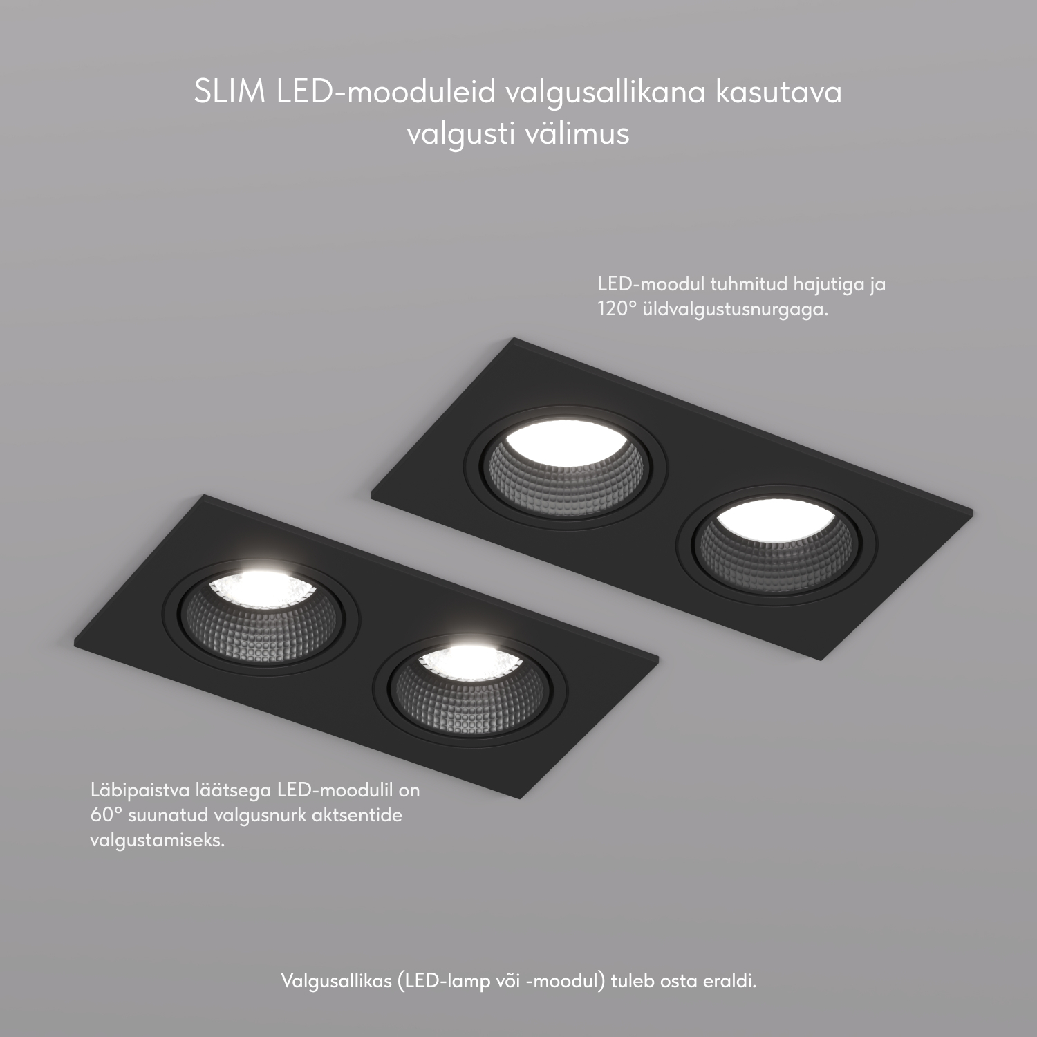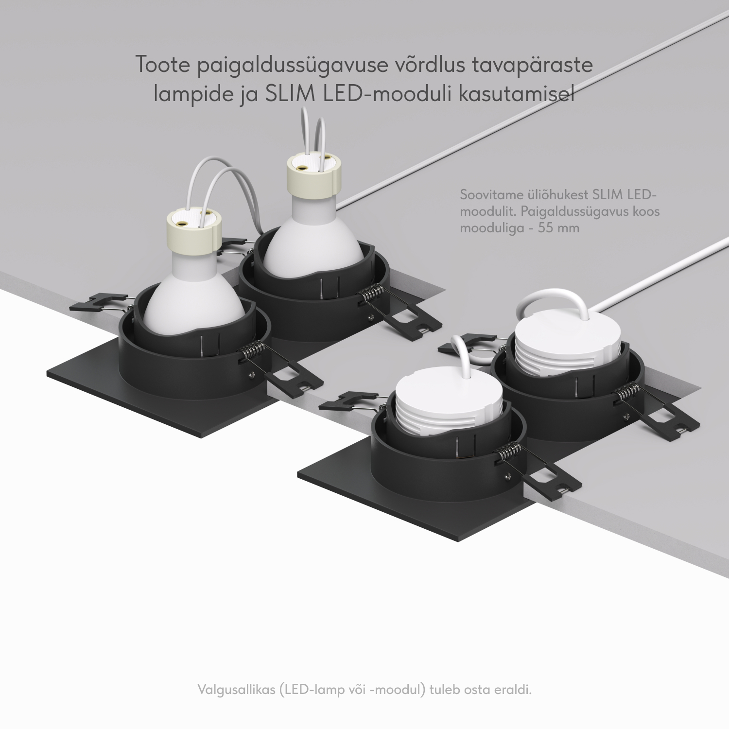 Sisseehitatud osa sügavus GU10 lambiga (kaasas hoidik): 88 mm. Sellest tavalise MR16 lambi kõrgus: 54 mm. Sisseehitatud osa sügavus DK/EU-4000-7W või DK/EU-3000-7W mooduliga on vaid 55mm. Valgusti on mõeldud kasutamiseks koos LED-lambiga. Muud tüüpi lampide paigaldamine ei ole lubatud.