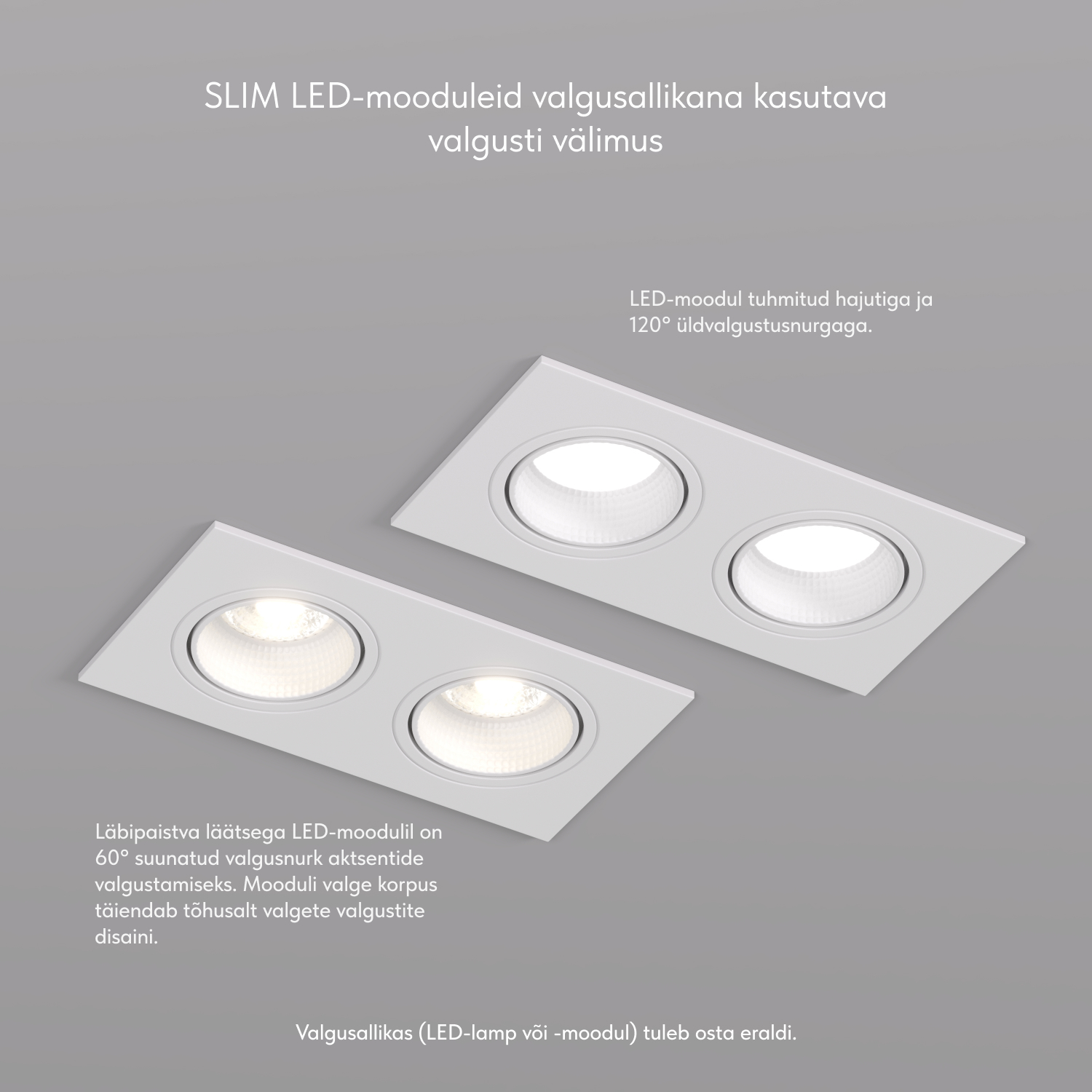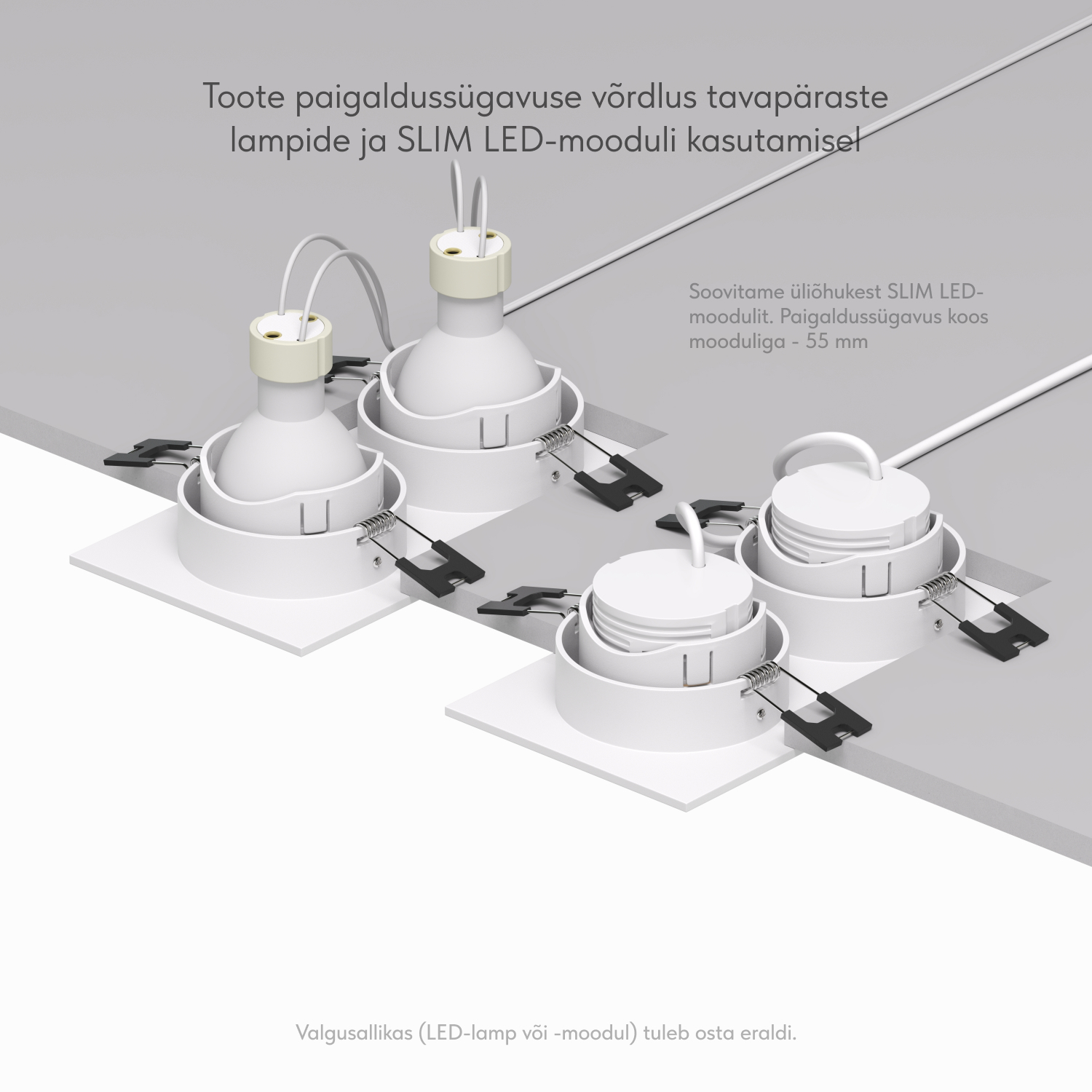 Sisseehitatud osa sügavus GU10 lambiga (kaasas hoidik): 88 mm. Sellest tavalise MR16 lambi kõrgus: 54 mm. Sisseehitatud osa sügavus DK/EU-4000-7W või DK/EU-3000-7W mooduliga on vaid 55mm. Valgusti on mõeldud kasutamiseks koos LED-lambiga. Muud tüüpi lampide paigaldamine ei ole lubatud.